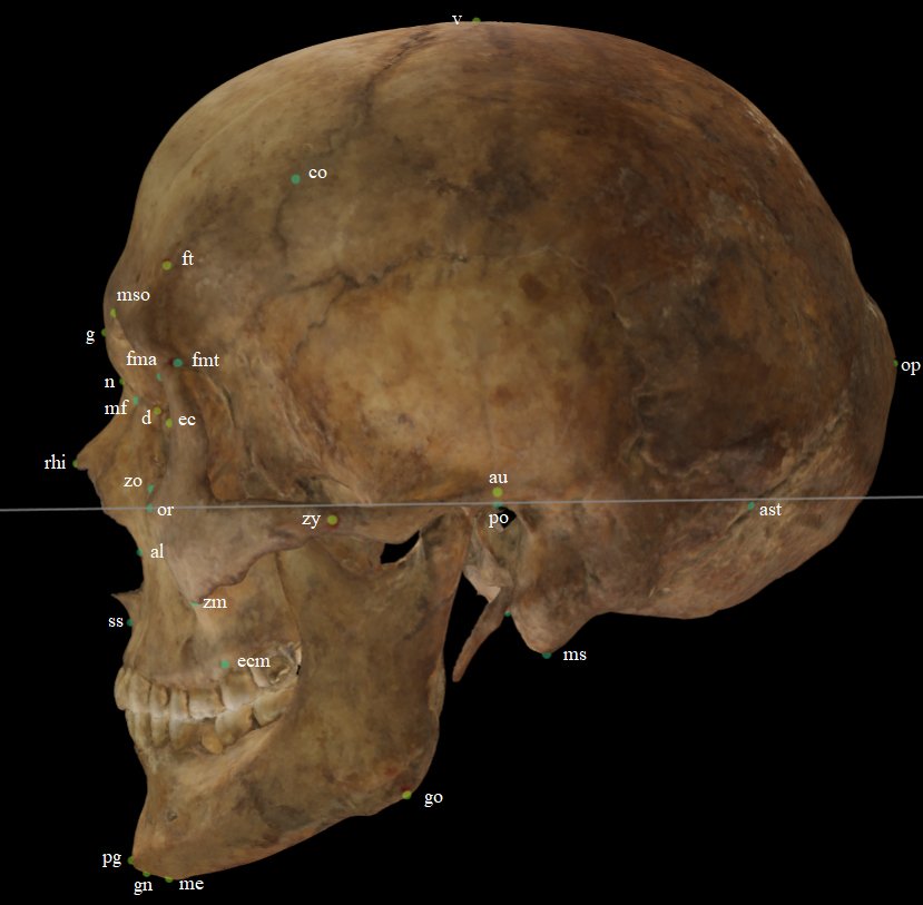 Fig. 1. Puntos craneométricos en modelo 3D del cráneo según vista frontal/lateral.